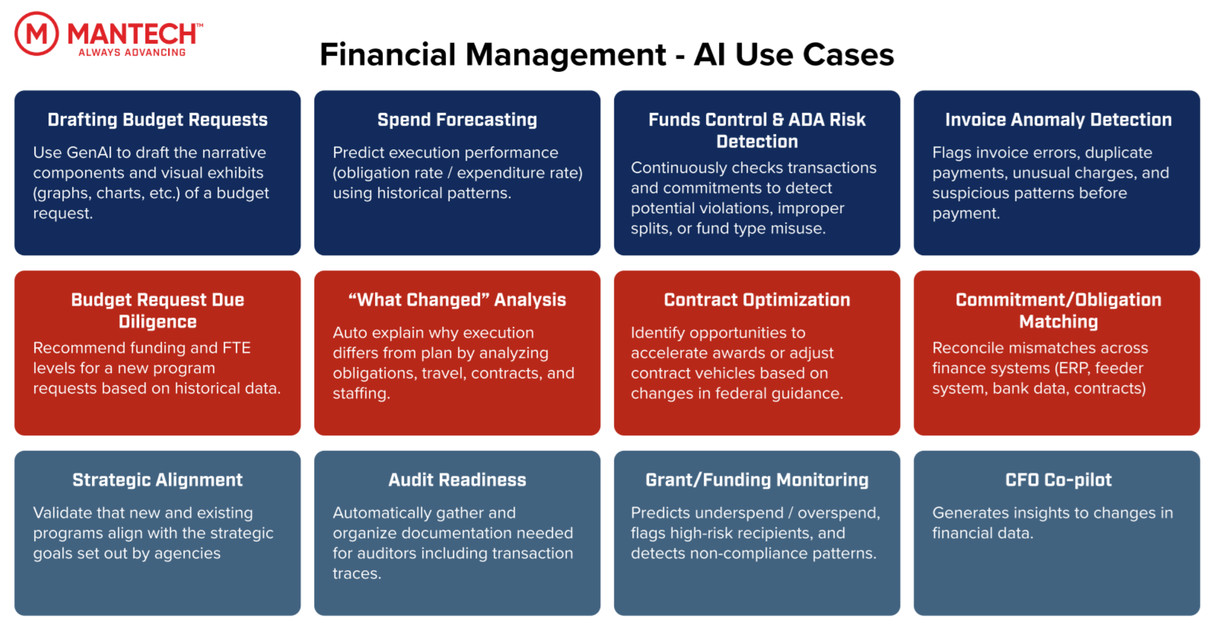MANTECH’s Financial Management team empowers federal agencies to overcome these challenges with innovative digital transformation solutions specifically tailored to the unique needs of the public sector. We modernize budgeting, financial reporting, and performance management, enabling agencies to: